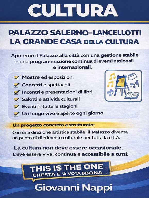 Allo stesso tempo, investiremo in una programmazione culturale continua e di qualità: il Palazzo Salerno-Lancellotti diventerà la grande casa della cultura, con eventi, mostre, spettacoli e iniziative aperte tutto l’anno.