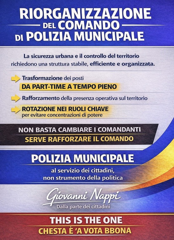 Una città funziona quando il Comune è organizzato, trasparente ed efficiente. Per questo riorganizzeremo il Comando di Polizia Municipale: più presenza sul territorio, contratti a tempo pieno e rotazione nei ruoli chiave per garantire equilibrio e controllo. La sicurezza si costruisce rafforzando il sistema.