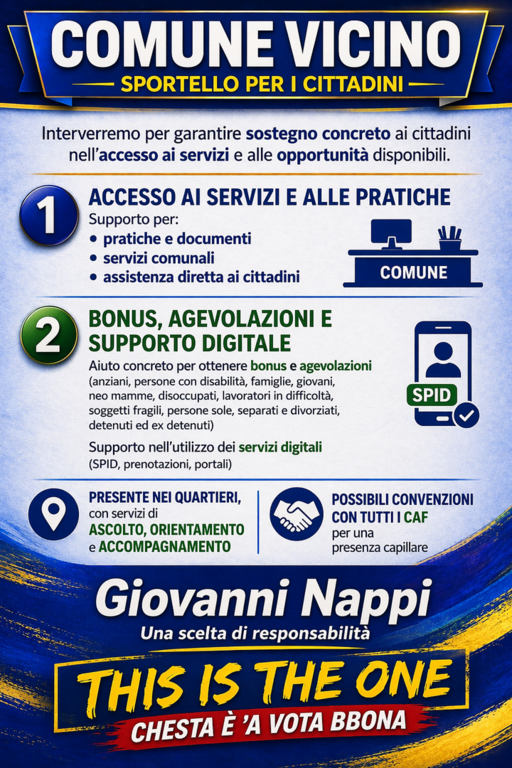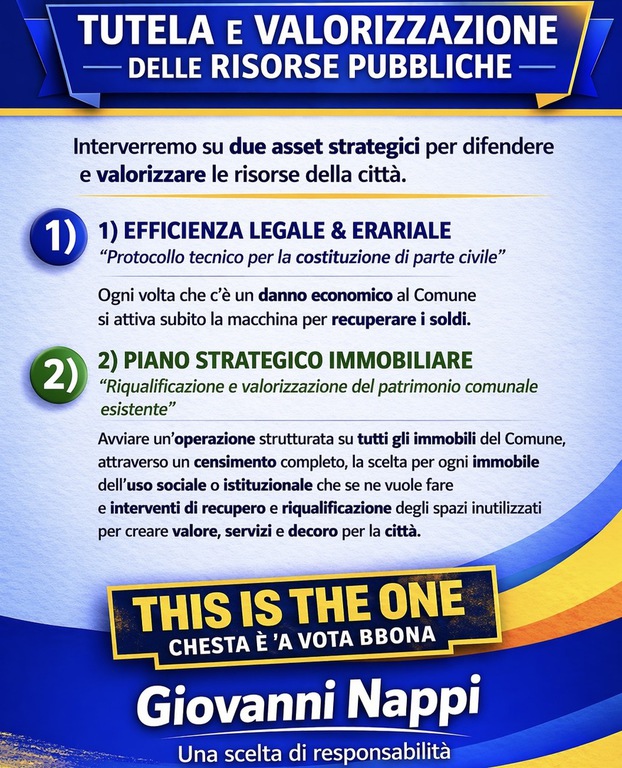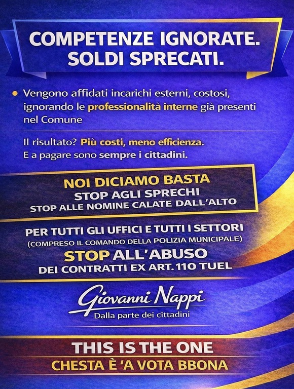 Un cambiamento vero, che parte dalla mentalità e si traduce in un Comune più forte, giusto ed efficiente, capace di trasformare le risorse in servizi, valore e decoro per tutta la comunità.