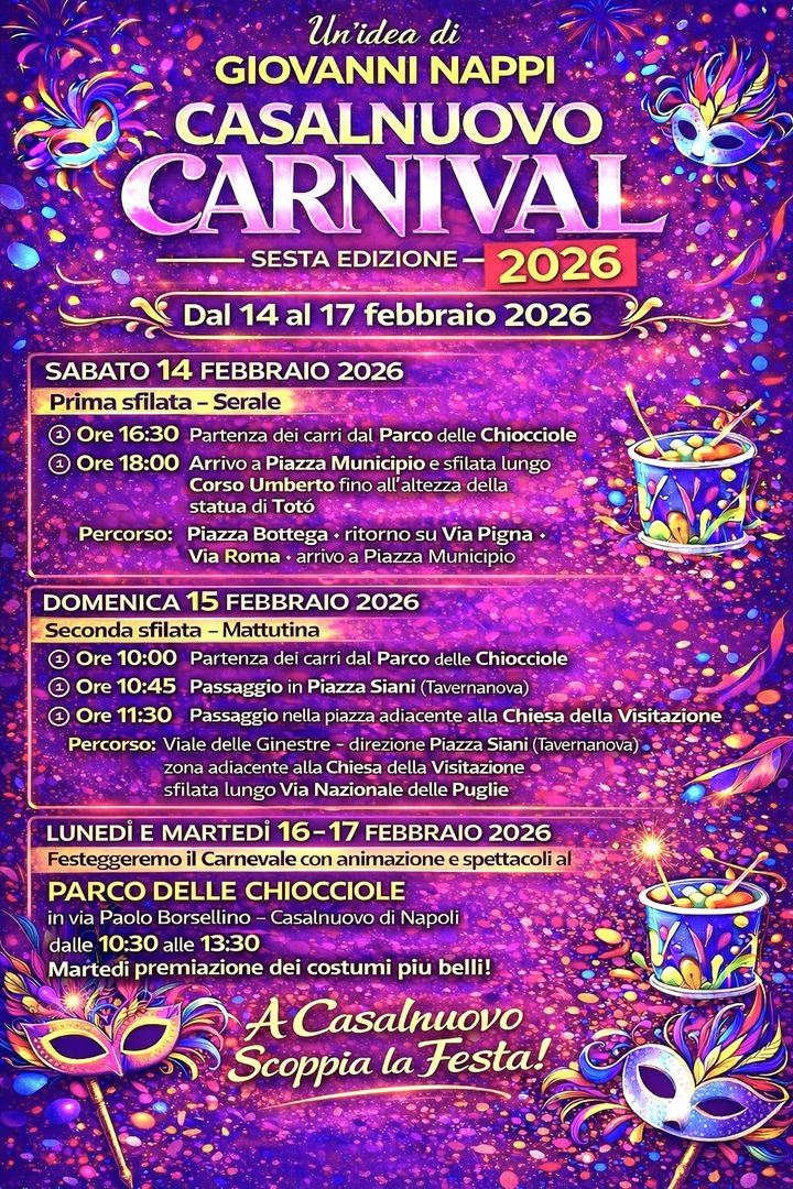 Il Carnival in Casalnuovo, ideato da Giovanni Nappi, è giunto alla sua sesta edizione continuativa. L'iniziativa si è fermata solamente nei due anni del covid. Oggi è tra gli eventi più attesi in città.